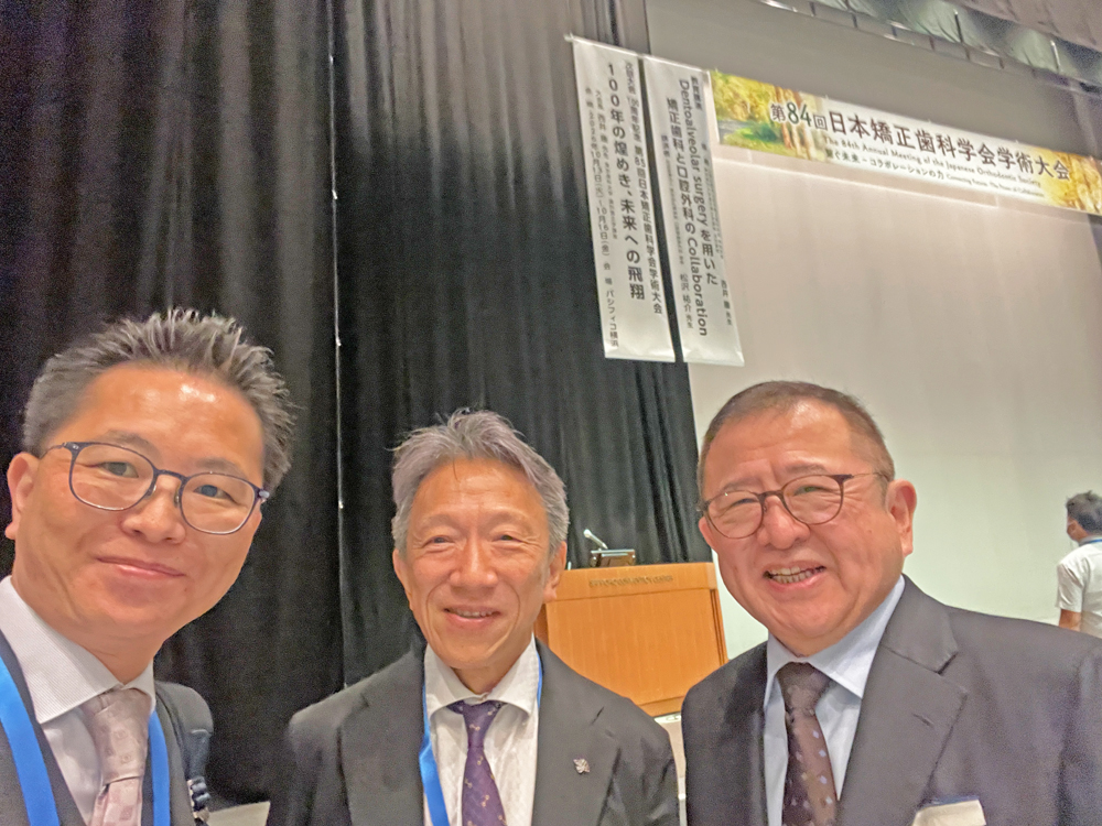 <学会スナップ写真>は北海道大学矯正の佐藤嘉晃教授(右側)、いちかわ矯正歯科の村松裕之先生(中央)と<日本矯正歯科学会の閉会式>で。東京医科歯科大学<現:東京科学大学>を卒業後、同大学顎顔面矯正学講座での専攻生課程を経て、2008年JR南武線・武蔵新城駅前にイデア矯正歯科を開院。2001年〜日本矯正歯科学会認定医4回更新